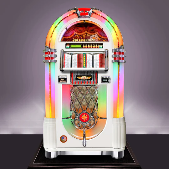 Drawing inspiration from the Wurlitzer 1015, the world’s first ‘original jukebox’, this classic design has endured over 50 years with very few changes, and continues to be one of the Games Room Company’s most popular products. The Bubbler shares the Wurlitzer’s famous grille, which is made from die-cast metal and gets its name from the pockets of air that float up to the top of the eight bubble tubes lining the machine. These bubbles slide through the deep, hypnotising colours created by the rotating pilasters, making the Bubbler as enchanting to the eye as it is to the ear. This beautiful, iconic machine is robust too, with a strong hand-built cabinet which comes in a choice of light oak, walnut, or satin black and now white, which allows some of the wood grain to show through. Also available at a slightly higher cost are gloss black and gloss white finishes.